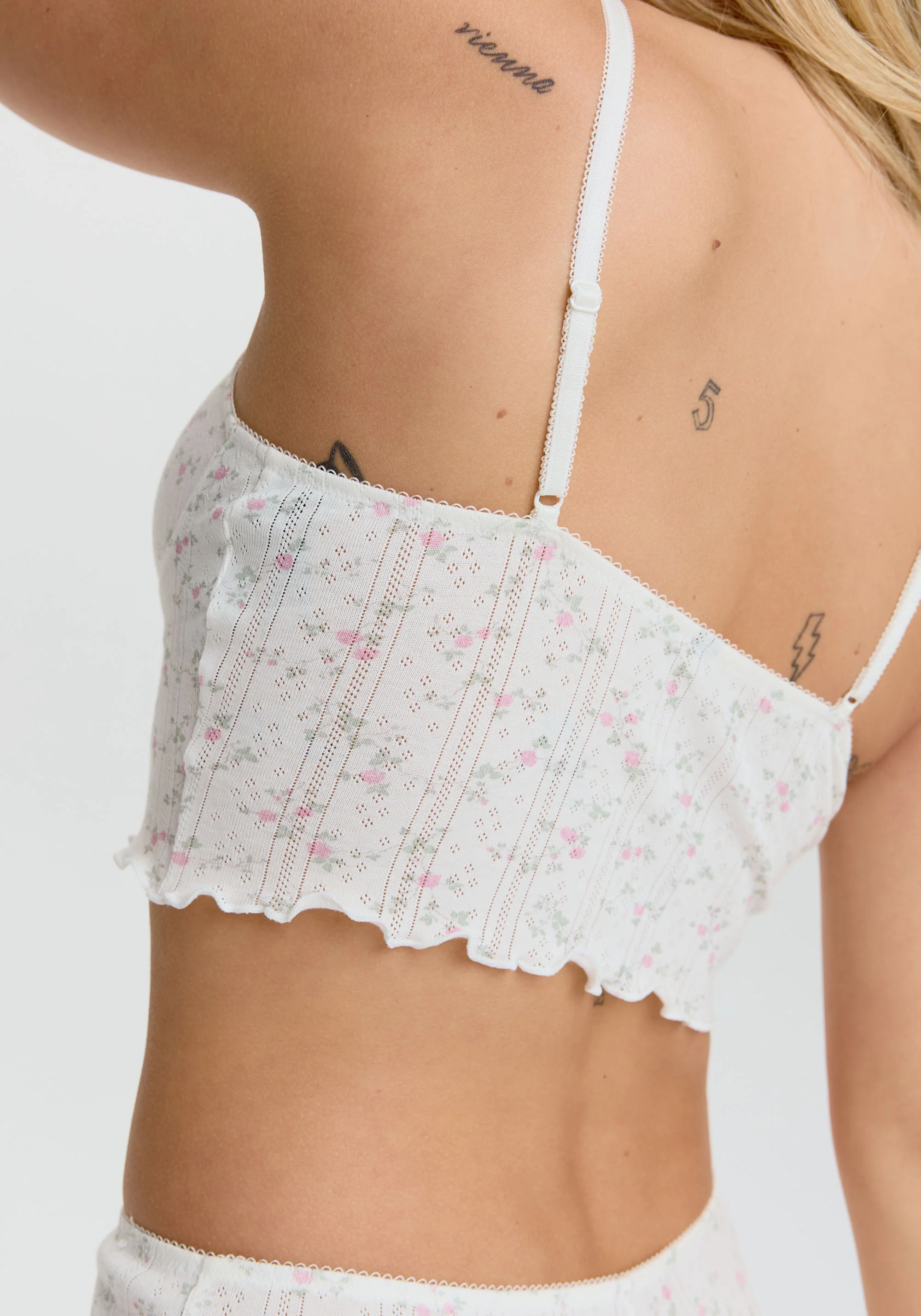 divine details: soft cotton pointelle, romantic ruffle hem, pretty pink rosette, picot trim. a crop cami top soft enough to sleep in but cute enough to style with your fave denim shorts during your summer escapades? we’re in.