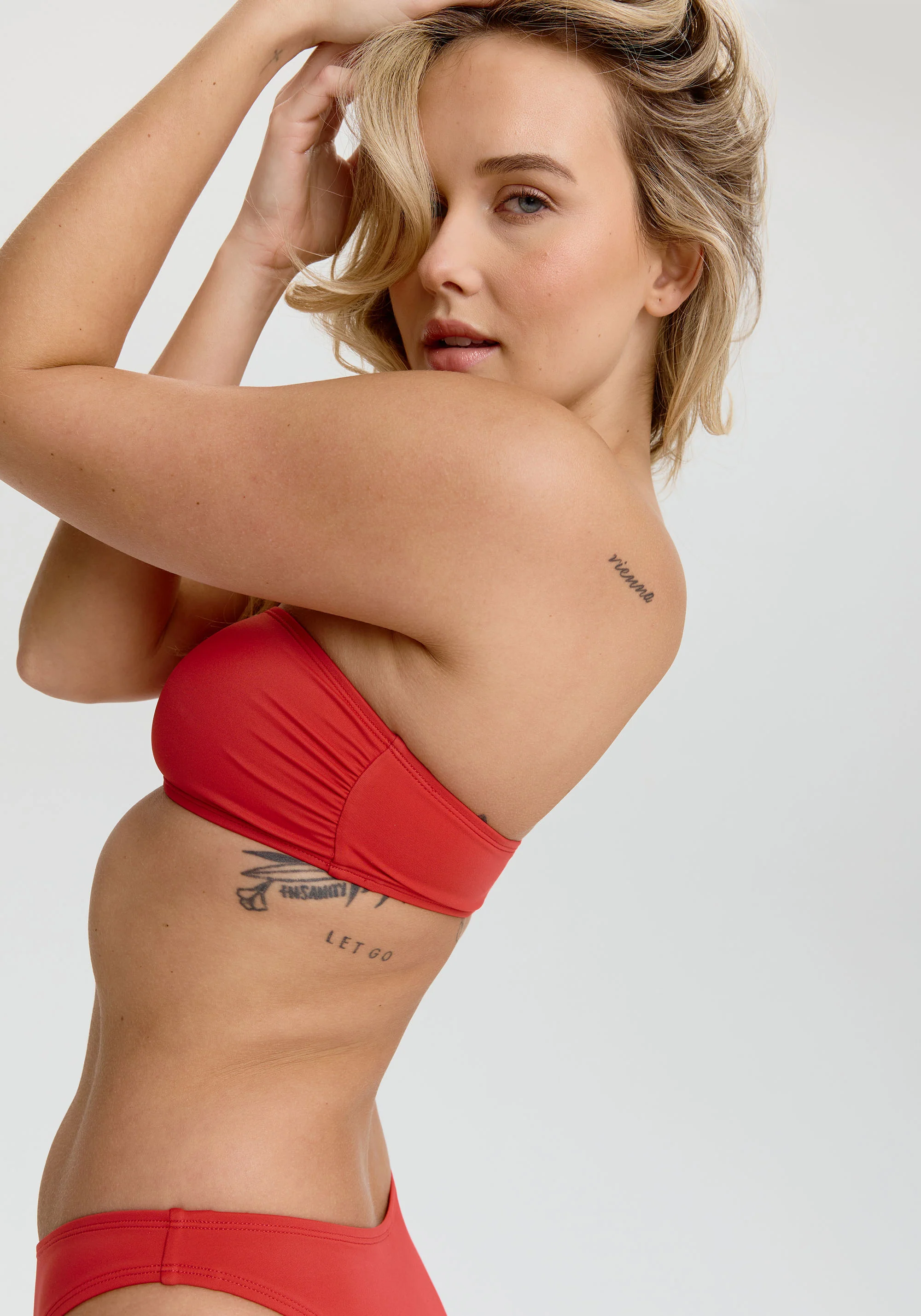 the playful yet versatile bandeau bikini top – wear it your way: as a classic bandeau or cinched in the middle with strings that can be tied around your neck. prepare for playful poolside perfection!